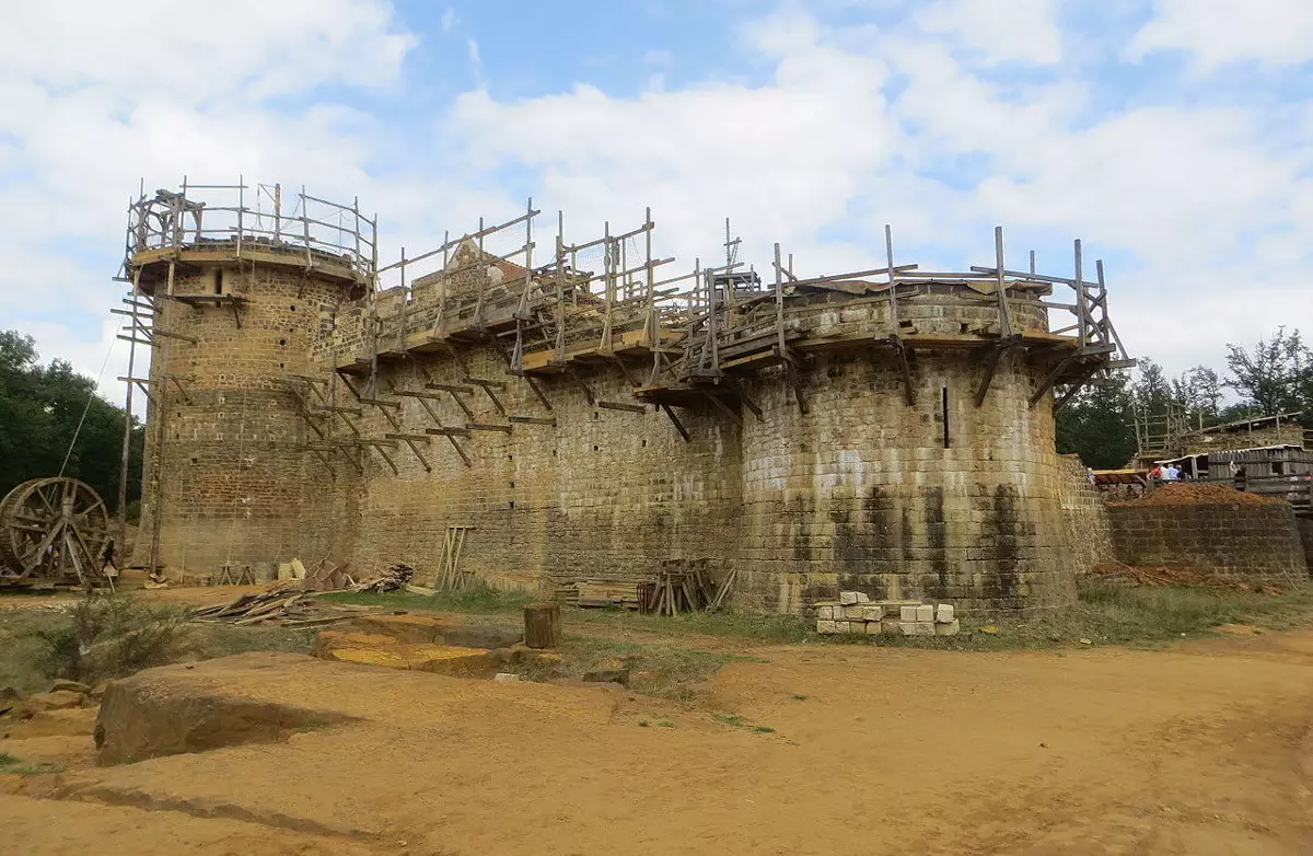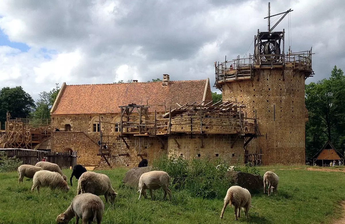 De la mano de Jacques Moulin, arquitecto al frente del proyecto que diseñó el castillo inspirado por las fortificaciones de los siglos XII y XIII, el proyecto ha dado significativos pasos hacia adelante en sus casi dos décadas de existencia. Una gran torre y la estancia principal ya están levantadas. Todo lo que podemos observar en las fotos se ha hecho respetando al milímetro las condiciones de trabajo medievales. El edificio está compuesto de madera, piedras y cal, y los materiales han sido obtenidos en bosques y canteras cercanos, tal y como se hacía en la Edad Media.