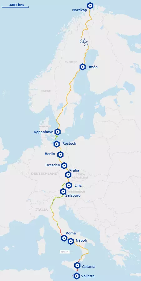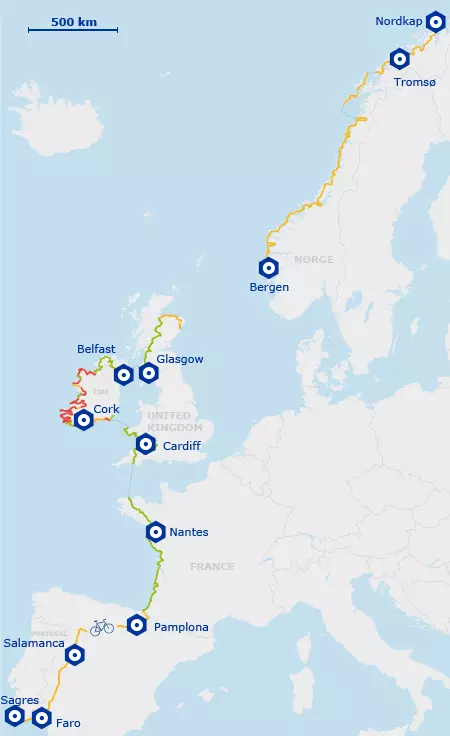 Los 8.186 kilómetros de extensión unirán seis países partiendo por Nordkapp en Noruega, pasando por Reino Unido, Irlanda, Francia, España, hasta llegar a Sagres, al sur de Portugal.