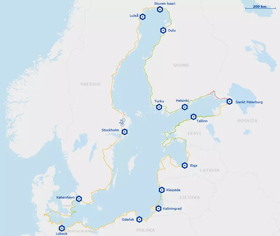 Lo atractivo de este camino es que comienza y termina donde uno quiere, ya que es la única ciclovía de las 15 que permite volver al lugar de inicio. En 7.980 kilómetros conectará nueve países: Lituania, Letonia, Estonia, Rusia, Finlandia, Suecia, Dinamarca, Alemania y Polonia.