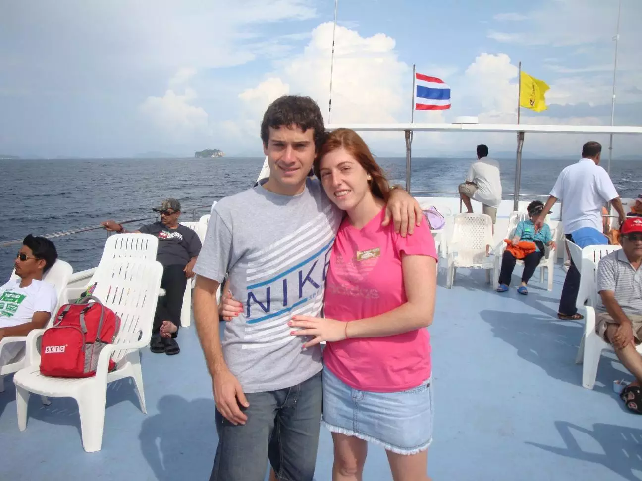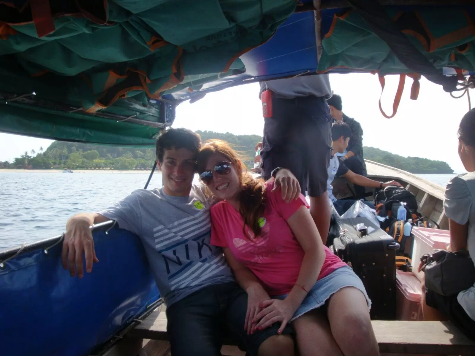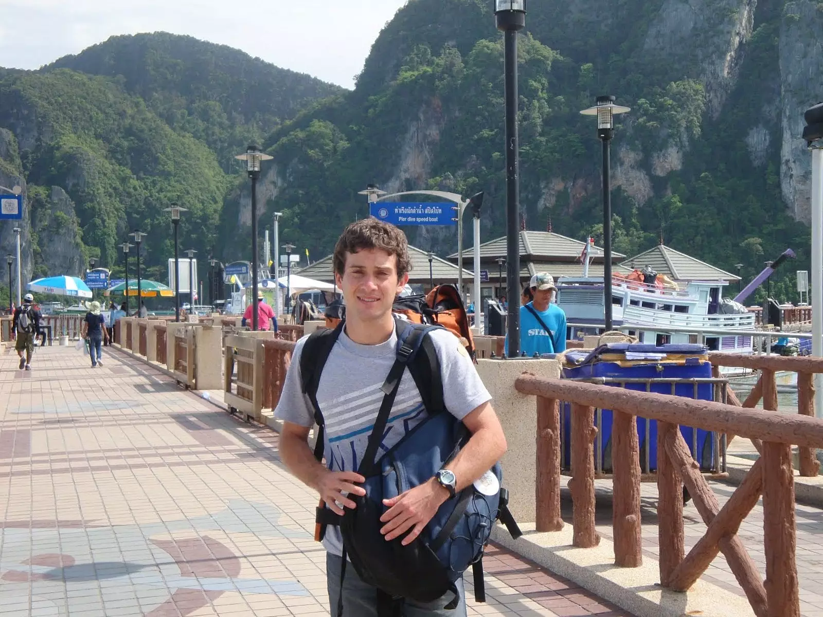 Jueves 5 de Mayo. Una camioneta tipo minibus nos pasó a buscar por el hostel y junto a otras personas más nos llevó al Pier para tomar el ferry. Durante el viaje en ferry conocimos a dos españoles y a un argentino que trabajaban en Andorra en un centro de ski. Fue un momento agradable ya que pudimos hablar español con otra gente después de varios días de viaje. Luego de 1h 30min llegamos al Pier de Phi-Phi island. Miramos la costa, la arena, el agua y la playa, pero eso no cumplía con nuestras expectativas sobre el lugar. Definitivamente en esa playa donde había un tráfico incesante de barcos y lanchas no queríamos estar. No teníamos alojamiento reservado pero queríamos algo lindo y tranquilo. Al bajar a tierra se te acercaban muchos vendedores a ofrecerte alojamiento. La gran mayoría de los turistas optaba por hospedarse en las playas cercanas al centro de la isla. Nosotros, en cambio, optamos por ir a una zona más exclusiva donde las playas son más grandes y más tranquilas. Aquí todo se puede negociar, por lo que luego de decidirnos por el alojamiento y negociar el precio, hicimos unas compritas en unas tiendas de la zona céntrica al Pier.