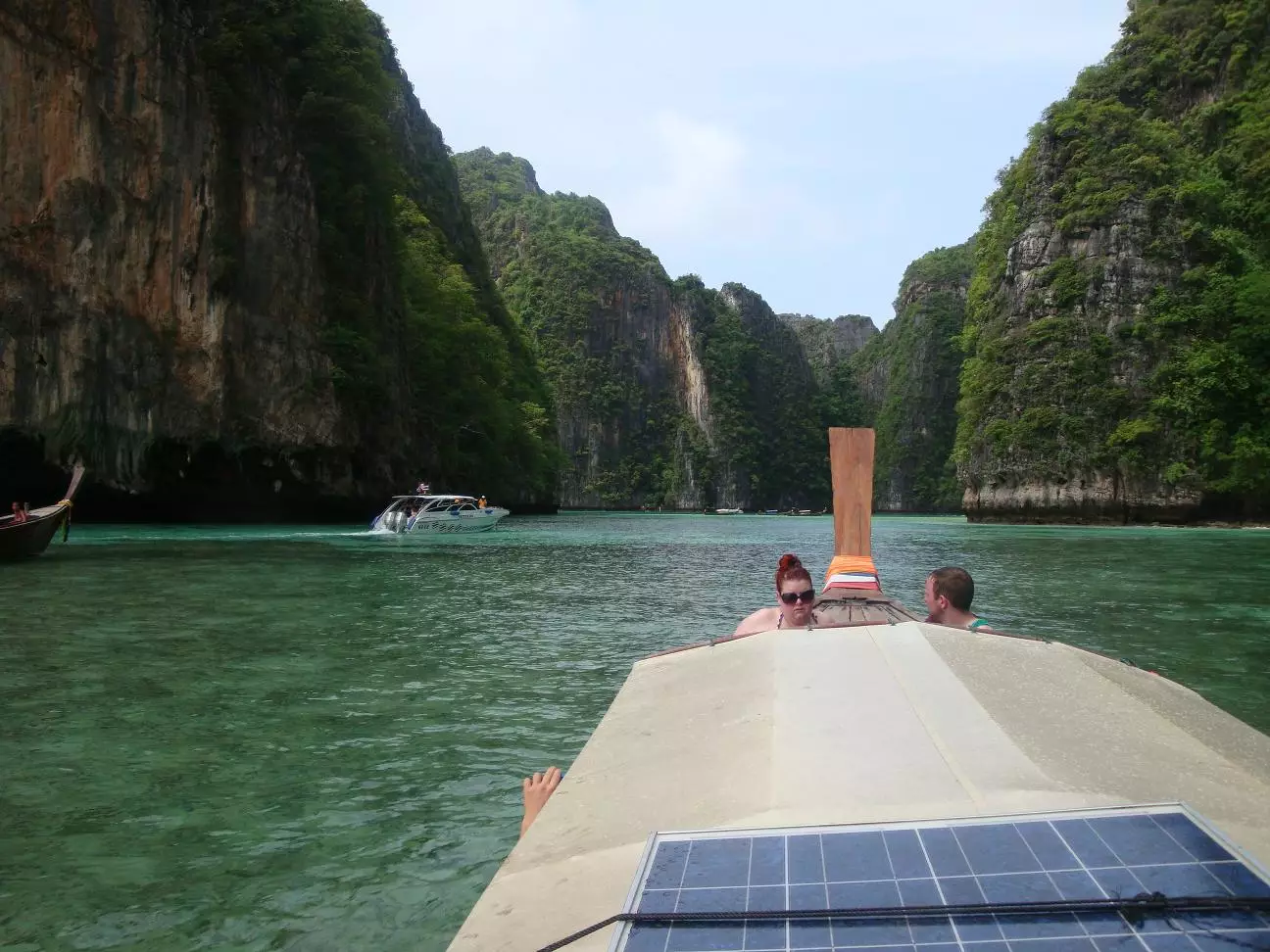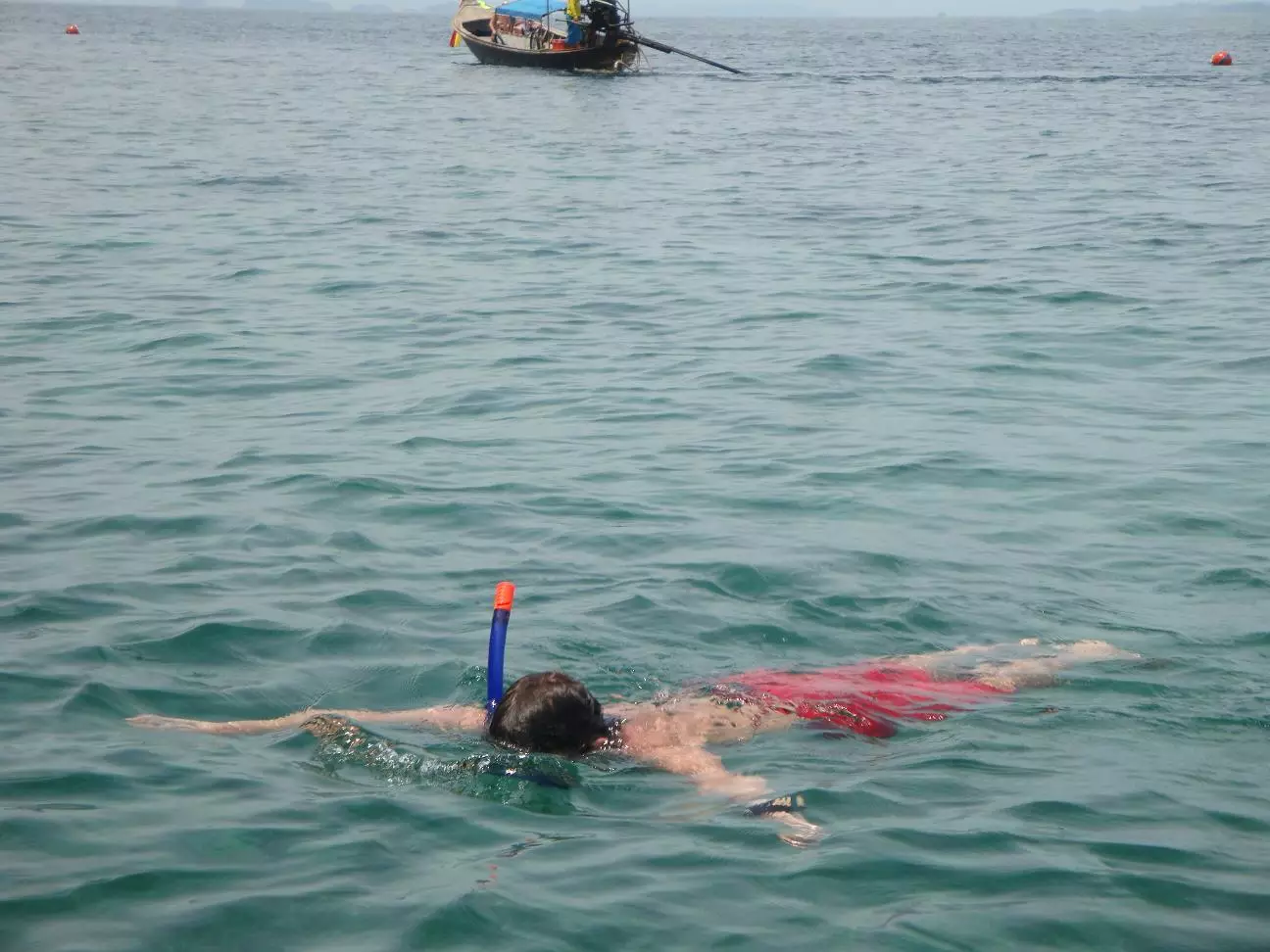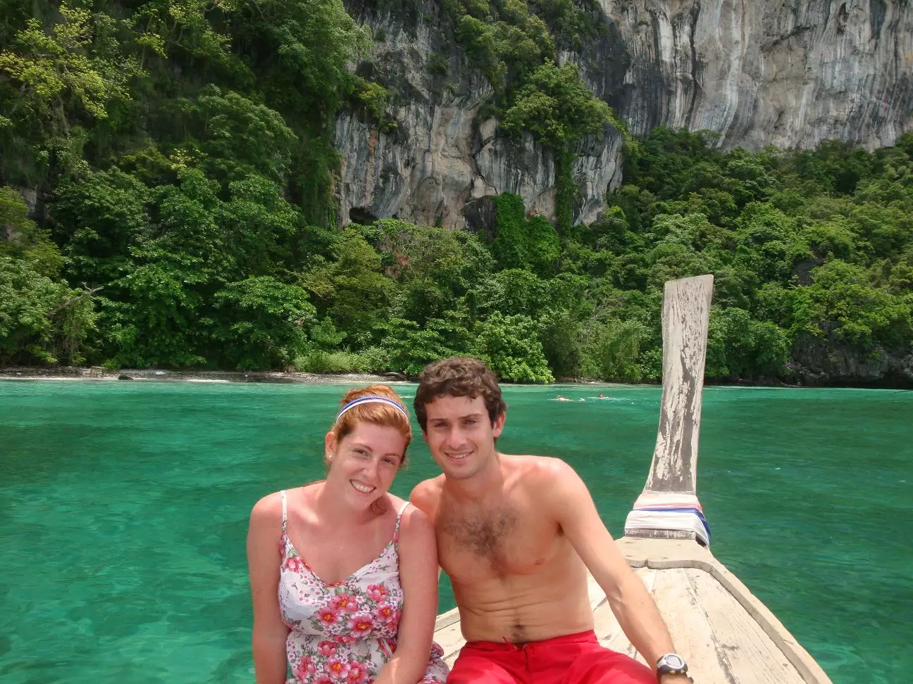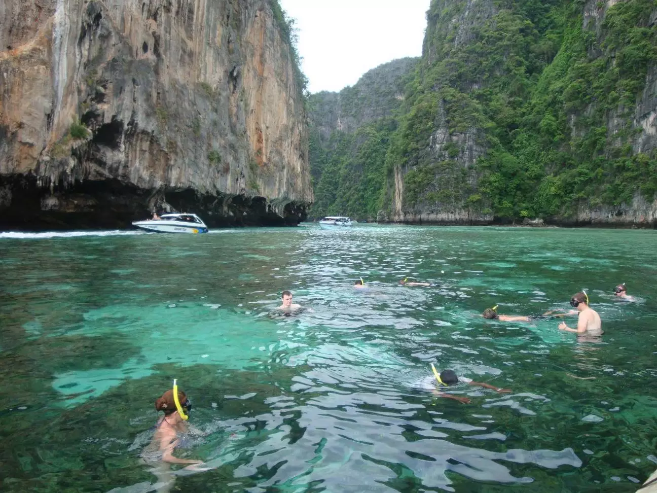 Miércoles 11 de Mayo. Como eran nuestras últimas horas en la isla, hicimos la excursión más típica que ofrecen los cientos de negocios y agencias de turismo que hay en esta parte de la isla especialmente dedicados al turista. Cerca de esta isla hay otra isla deshabitada llamada Phi Phi Lay. Esta se hizo famosa cuando Leonardo Di Caprio filmó la película “La Playa” en una playa escondida aquí adentro. Esta excursión consistía en pasar por unas cuevas metidas dentro de una montaña en el medio del mar, luego meterse con la precaria embarcación de madera en unas especies de lagunas formadas en medio del mar y rodeadas de grandes formaciones montañosas con una cara o ladera plana. Aquí nos dieron tiempo como para que nademos y disfrutemos un poco de este mágico lugar. Luego nos llevaron a una parte donde habían muchas piedras y peces de colores para hacer snorkel.