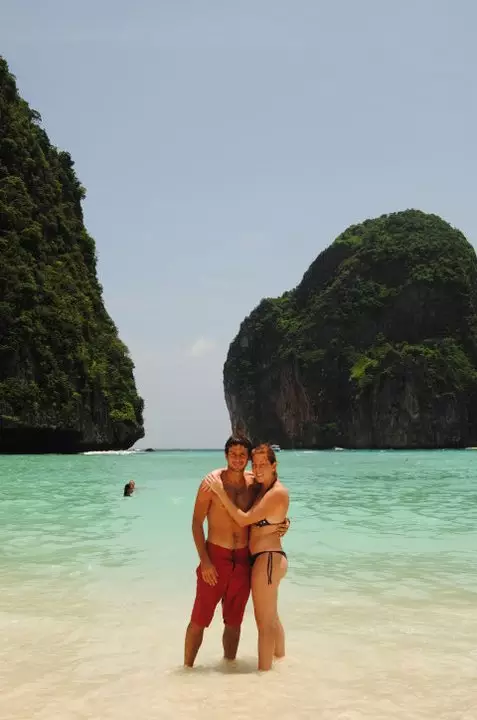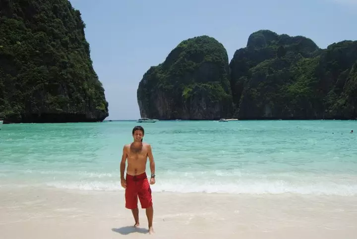 Pero la perla de la excursión todavía no había llegado. Era la siguiente parada. Maya Bay, hermosa y soñada playa escondida en una bahía de Phi Phi Lay, era el lugar esperado por todos los que íbamos en la excursión. Aquí nos dejaron unos cuarenta minutos aproximados para que hagamos lo que queramos. El acceso a esta playa es un poco complicado debido a que los botes tienen el acceso prohibido a la bahía no sabemos bien porque. El bote nos dejó del otro lado de unas rocas y con la ayuda de unas sogas había que nadar un tramo y luego subir y bajar unos escalones para luego caminar unos cien metros hasta Maya Beach.