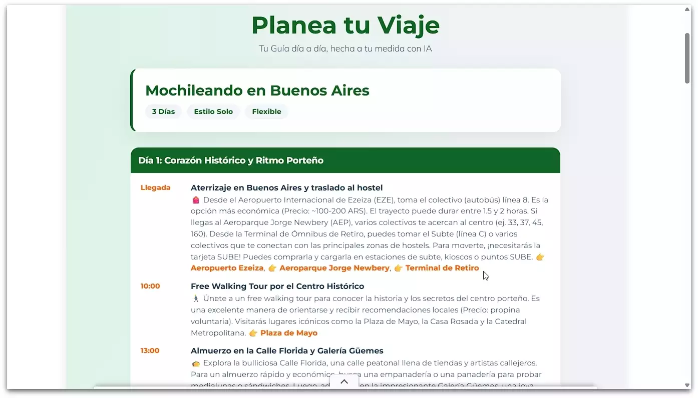 Al hacer clic en «Generar Plan de Viaje con IA», obtendrás un itinerario detallado día por día, con consejos de seguridad, tips sobre los platos típicos del lugar, actividades imperdibles y mucho más. Y lo mejor: puedes descargar todo el plan en PDF.
