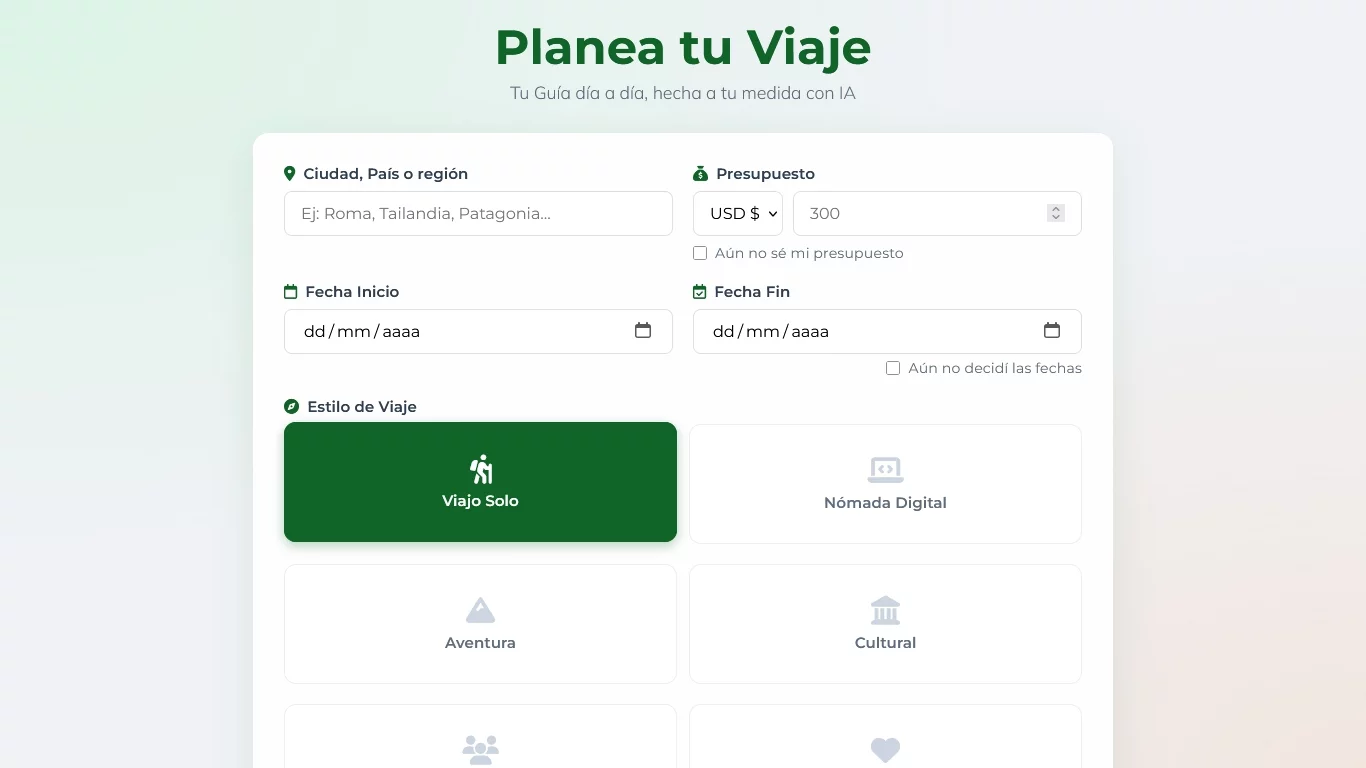 - Fechas y Presupuesto (Opcional): Si ya sabes cuándo vas y cuánto quieres gastar, agrégalo. Si no, puedes saltar este paso.