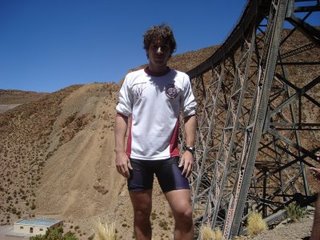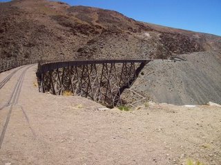 A pesar de no haber dormido bien, con el correr de la mañana me fui sintiendo bien. La idea del día era ir a conocer el Viaducto La Polvorilla (4200 msnm). Este es el punto más famoso y más alto por el que pasa el Tren a las Nubes y está a una distancia de 20 Km. de San Antonio. El camino era totalmente de ripio con pendientes prolongadas, mucho serrucho, pozos y arena. Era realmente una tortura ese camino para hacer en bicicleta. A los 5 Km. se podían visualizar unas piletas con aguas termales que pertenecían a un complejo termal, hoy en ruinas. El paisaje era típico de la puna andina, con montañas muy altas y áridas con escasa vegetación. Cuando habíamos hecho más de la mitad de camino vemos que se acerca una camioneta. Nos miramos entre los tres y le hacemos señas como para que nos lleve. Accedieron instantáneamente y nos ubicamos en la caja de la Ford. Una última subida permitía ver desde lejos la imponente construcción del Viaducto La Polvorilla en toda su dimensión. Esta tiene 224 m de largo y 63 m de altura. Esta magnifica obra de ingeniería describe un arco sobre el que sientan las vías del ferrocarril. La cantidad de rulos, viaductos, túneles, y otras sinuosidades que recorre el tren se debe a que el autor del proyecto, el Ing. Maury, tomo partido teniendo en cuenta el principio de adherencia de las ruedas del tren a las vías y por las leyes de la física, desechando el sistema mecánico de cremallera comúnmente usado para que los trenes puedan trepar con solvencia las alturas. Habíamos llegado a la base del puente y realmente impresionan las dimensiones de este. Nos tomamos las clásicas fotos y empezamos a subir al puente por un camino de zig-zag solo para peatones. Cada pocos pasos teníamos que parar a tomar aire debido a que nos provocaba mucha agitación el subir con tanta pendiente y sin tanto oxigeno en el aire. Una vez arriba del puente sacamos muchas fotos y pasamos un momento muy agradable. La vuelta fue en camioneta con los mismos muchachos que nos acercaron, y una vez que volvimos, los invitamos a comer unas empanaditas salteñas. Pasamos la tarde manteniendo una linda e interesante charla, que se fue dando sola y terminó dejando mensajes y conclusiones muy importantes y positivos para nuestras vidas. Por la noche Javier nos cocinó. Mas tarde fuimos a un boliche, en el que había poca gente y nos terminamos yendo temprano.