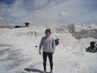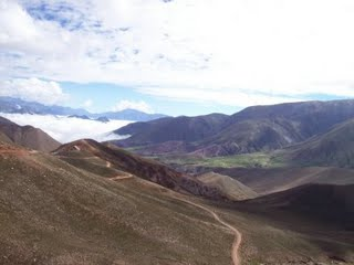 Como al día siguiente era mi cumpleaños y lo queríamos pasar en algún pueblo con gente, decidimos contratar una camioneta que nos lleve hasta Salinas Grandes, para después nosotros pedalear 65 Km. hasta Purmamarca, provincia de Jujuy. De lo contrario, no íbamos a llegar ya que hacer esos 165 Km. era algo inalcanzable en el día. Nos llevo un Sr. llamado Estaban Olmos junto con su changuito en su camioneta. Salimos alrededor de las 8:30 hs y por primera vez agarramos la famosa y mas larga Ruta Nacional Nº40 que une La Quiaca con Ushuaia. El paisaje era realmente bello, con laderas a ambos costados y unas hermosas montañas coloridas acompañaban el ripio con serrucho y bancos de arena. Este tramo de la RN 40 es muy poco transitado y causa de esto es que casi no hay poblados a lo largo de esta. Dejamos atrás la provincia de Salta y entramos en la jujeña. Ya se empezaba a ver el extremo de las Salinas Grandes. Empezamos a pedalear para este desierto de sal y el paisaje se tornaba cada vez más maravilloso. Era todo blanco. Todo sal. Nos fotografiamos de manera muy especial (se reserva el derecho de las fotos), y lentamente comenzamos a volver al cruce de la 40 y 51, para tomar esta ultima y hacer 60 Km. hasta Purmamarca. Toda la primer mitad es una larga y constante subida, que por momentos se tornaba imposible de subir en bici, y mas con los aproximadamente 12 Kg. que llevábamos de carga. Subiendo la Cuesta de Lipan, tuvimos que bajarnos de las bicis y empezar a caminar ya que de esta manera avanzábamos más. La suerte estaba de nuestro lado. Pasaban muy pocos vehículos, pero justo pasó un camión que transportaba cubos de sal, y nos hizo evitó el resto de la tremenda subida. El camión subía lento debido a toda la carga que llevaba encima, más una nueva adicional causada por tres locos con bicicleta. Una vez que alcanzamos los 4080 msnm, nos bajamos del camión y el frío de alta montaña se empezó a sentir. Nos abrigamos ya que teníamos por delante unos 38 Km. de bajada increíble. Fue la mejor parte sin lugar a dudas. Descender desde esa altura hasta llegar a Purmamarca (2450 msnm) fue adrenalina pura. Logramos velocidades muy altas y gozamos de unas vistas y paisajes indescriptibles. Cuando llegamos al pueblo de Purmamarca la duda era si acampar o ir a un hostel. Miramos al cielo y se veía venir la lluvia, así que paramos en un hostel. En esta región el cielo no miente y empezó a llover en forma pareja y constante.